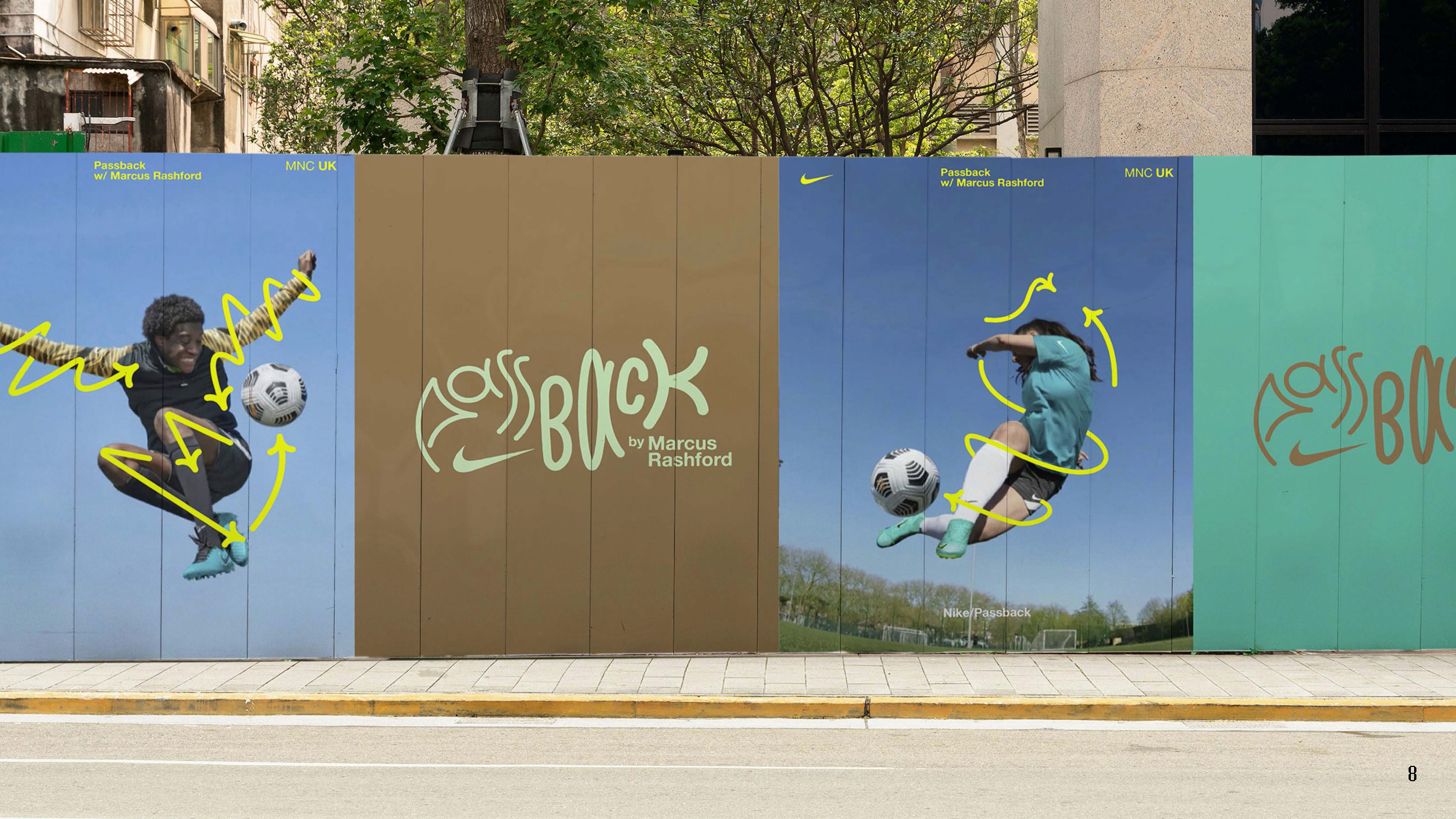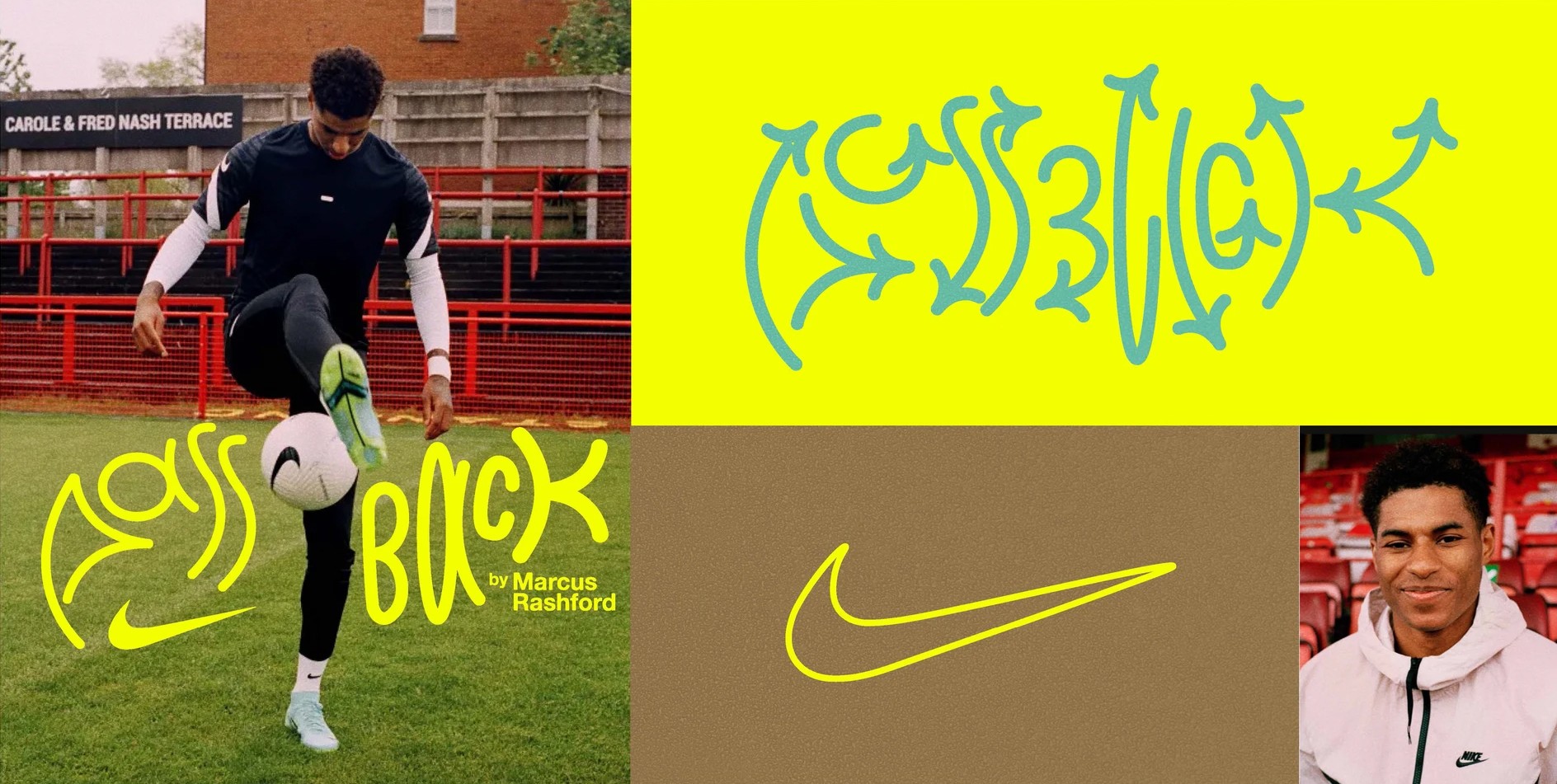 Working as a freelance designer with Studio Nari, I contributed to early conceptual design rounds for Nike Passback—a campaign in collaboration with Marcus Rashford. The ideas explored visual storytelling, typography, and spatial design to support a cause-driven narrative around access to football and community impact.